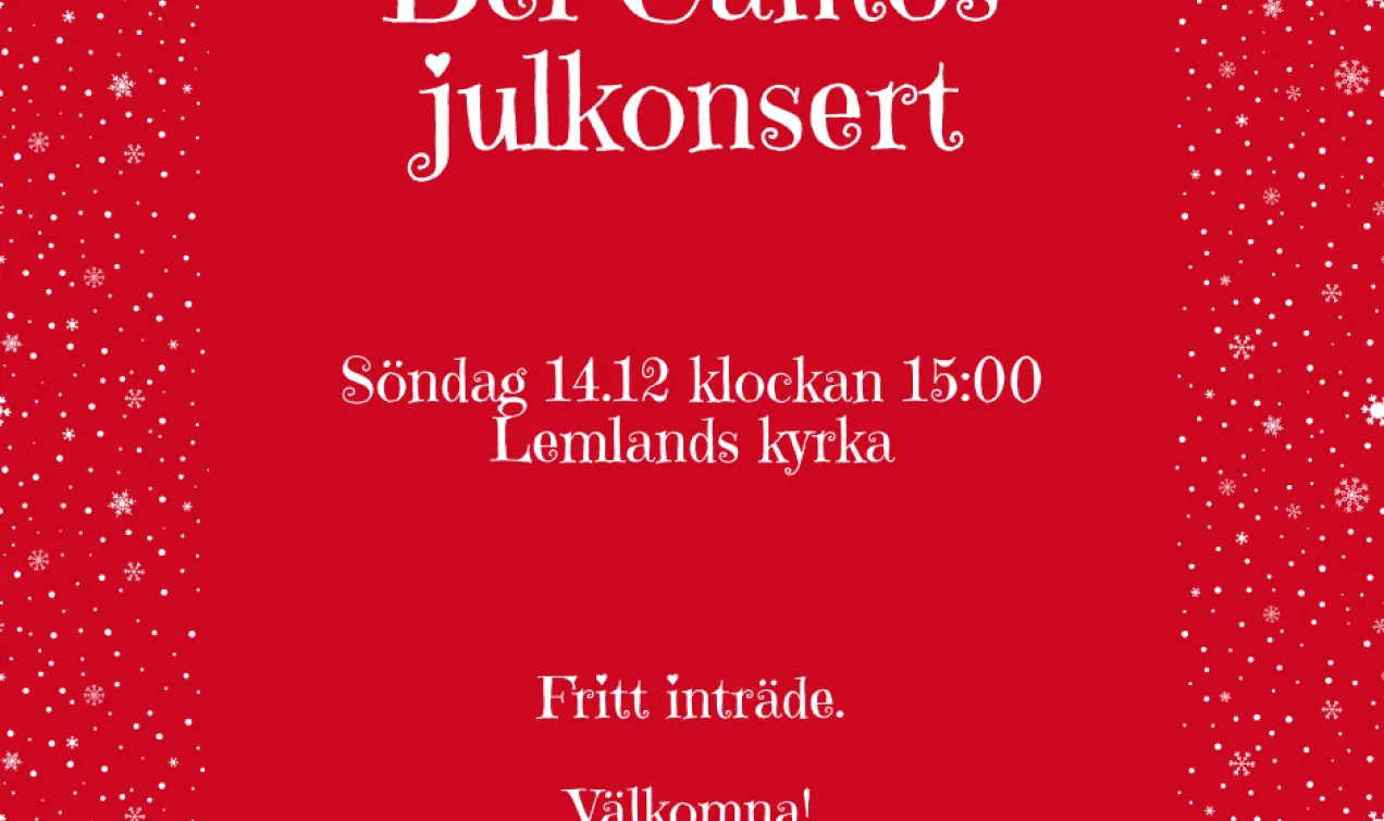 Söndagen den 14 december kl. 15.00 är alla välkomna till Lemlands kyrka för att komma i julstämning med Bel Cantos elever. På programmet står varierad och stämningsfull musik med juliga förtecken.
