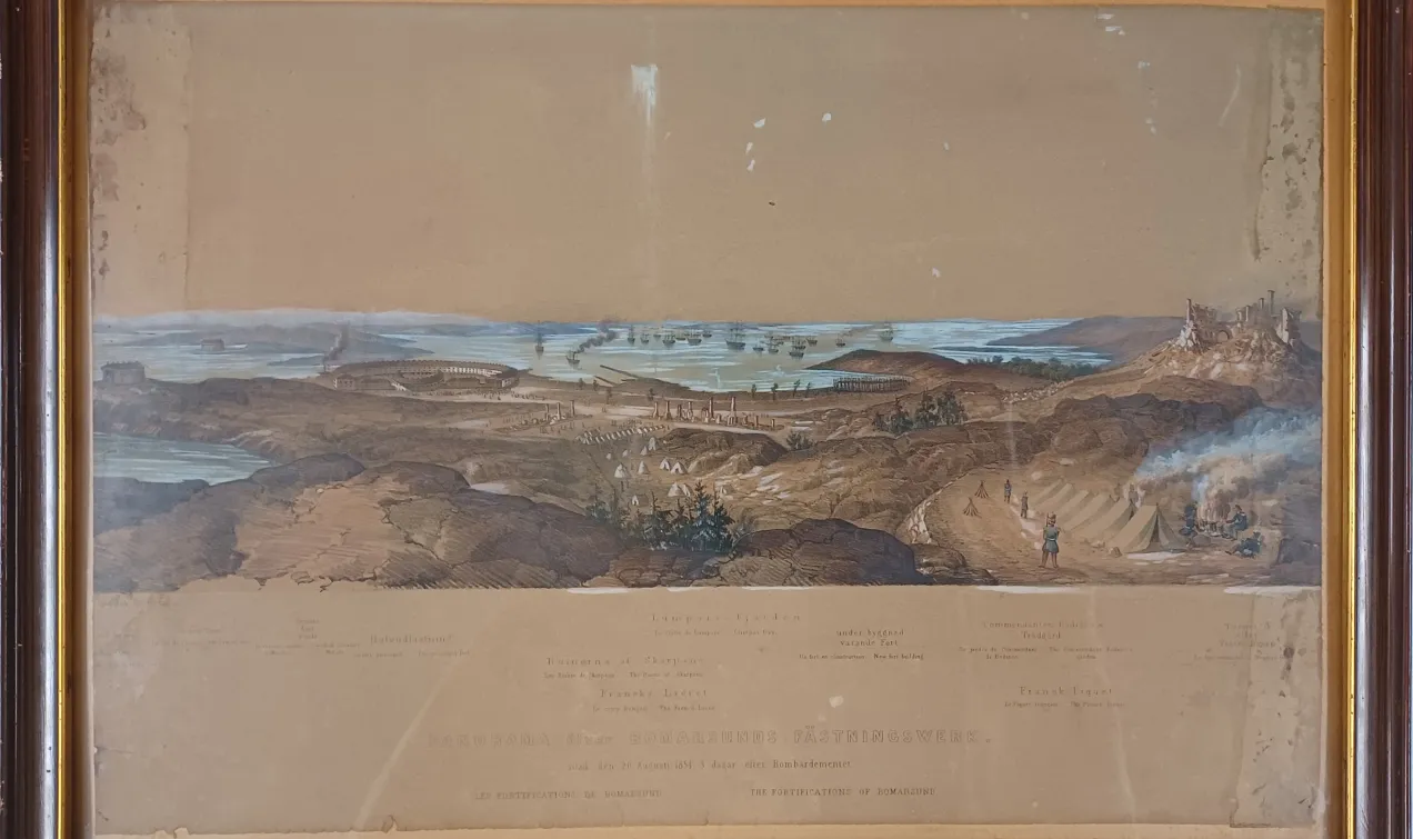 Välkommen på föremålsvisning av litografin Panorama över Bomarsunds fästningsverk av Johan Fredrik Meyer. Hembygdsforskare Johan Granlund berättar om verkets historia och vad motivet kan berätta om händelserna i Bomarsund 1854.