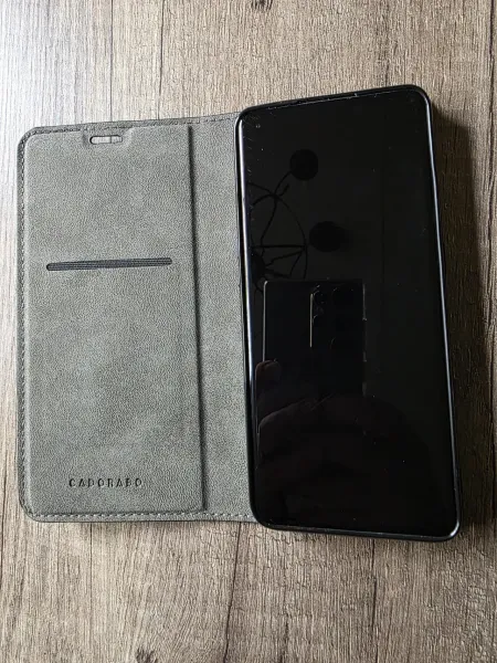 Funkar fint använt skick spricka baksida påverkar inte användningen. Helt nytt plånboksfodral och 2 skal.