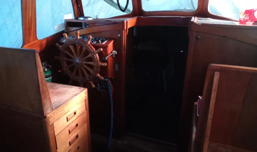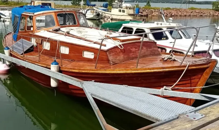 Fin och väldigt stadig båt i mahogny 9*3 meter med volvo b20, inget ruttet skrovet är i riktigt bra skick, däcket sku inte skadas av lite skrapning och lack, i övrigt är allt i ok bruksskick efter ålder som kapell dynor m.m. står just nu på land och motorn har jag börjat plocka lös för översyn då den läcker olja, så troligen nån packning, ny topplockspackning och o-ringar bytta för 1 år sen, renoveringssatts till förgasaren följer med samt extra motor. Finns kök diskho kylskåp wc, värmare med element, solpanel, stävstäge, sovplats för minst 4 vuxna en riktigt mysig båt , allt tekniskt skulle inte skada av en liten översyn följer med tåg och det mesta man behöver, finns i saltvik för påseende , perfekt vinter projekt som inte är så omfattande för att få en riktigt fin båt till sommaren priset kan diskuteras på plats, byten mot snurra/mindre plastbåt/trailer intressant