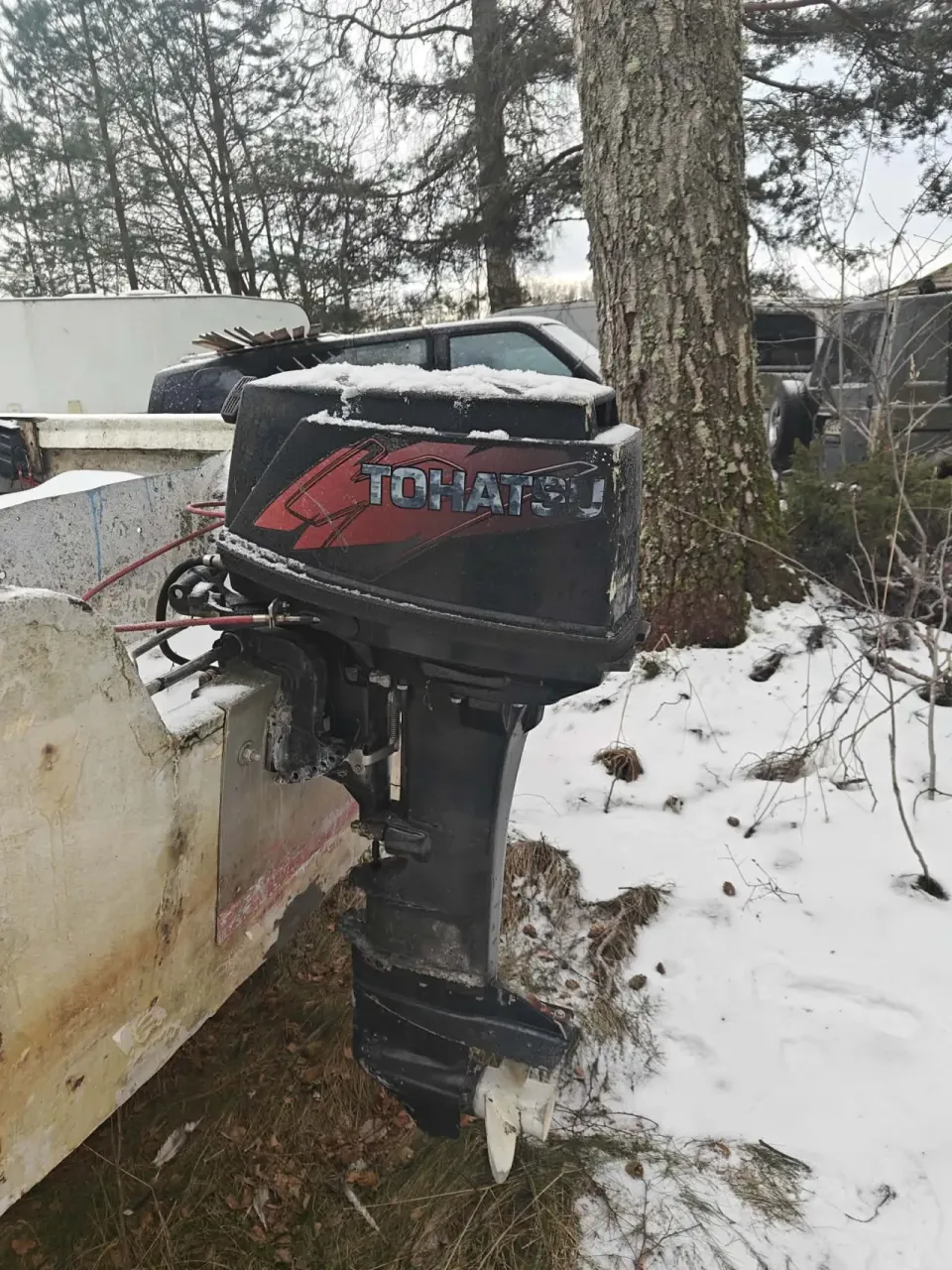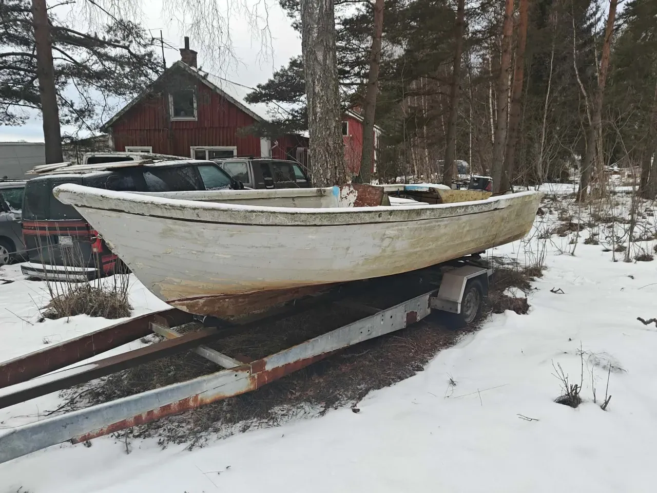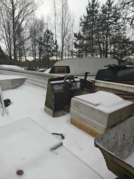 Stark arbetsbåt. ful å eländig men klarar nog vad som helst. 30hp Tohatsu, nyservad med ny impeller och drevolja i höstas. Trailern är lånad så den ingår inte.