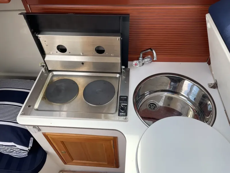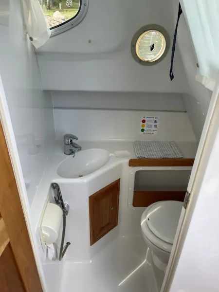Båten erbjuder generösa innerutrymmen med bra ståhöjd samt ett separat toalettrum. I fören finns två rymliga kojplatser, i aktern en stickkoj samt möjlighet att bädda upp ytterligare sovplatser för barn.