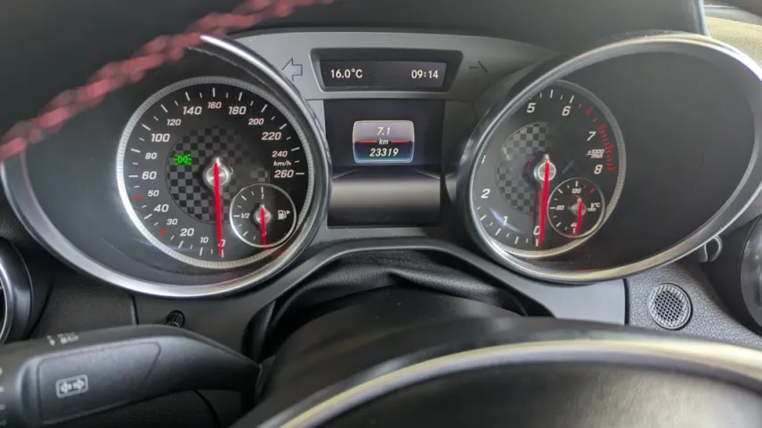 AMG Interiörpaket Dynamic Select Farthållare Navigation fram och bak Läderinredning Röda säkerhetsbälten Elbelagd taklucka Bluetooth LED-varselljus Kollisionsvarning med aktiv bromsfunktion 6-växlad manuell växellåda Sportchassi Stolsvärme för förare och passagerare fram AMG 5-ekrade fälgar 18" bredare däck bak, vinterdäck, 2 x nyckel