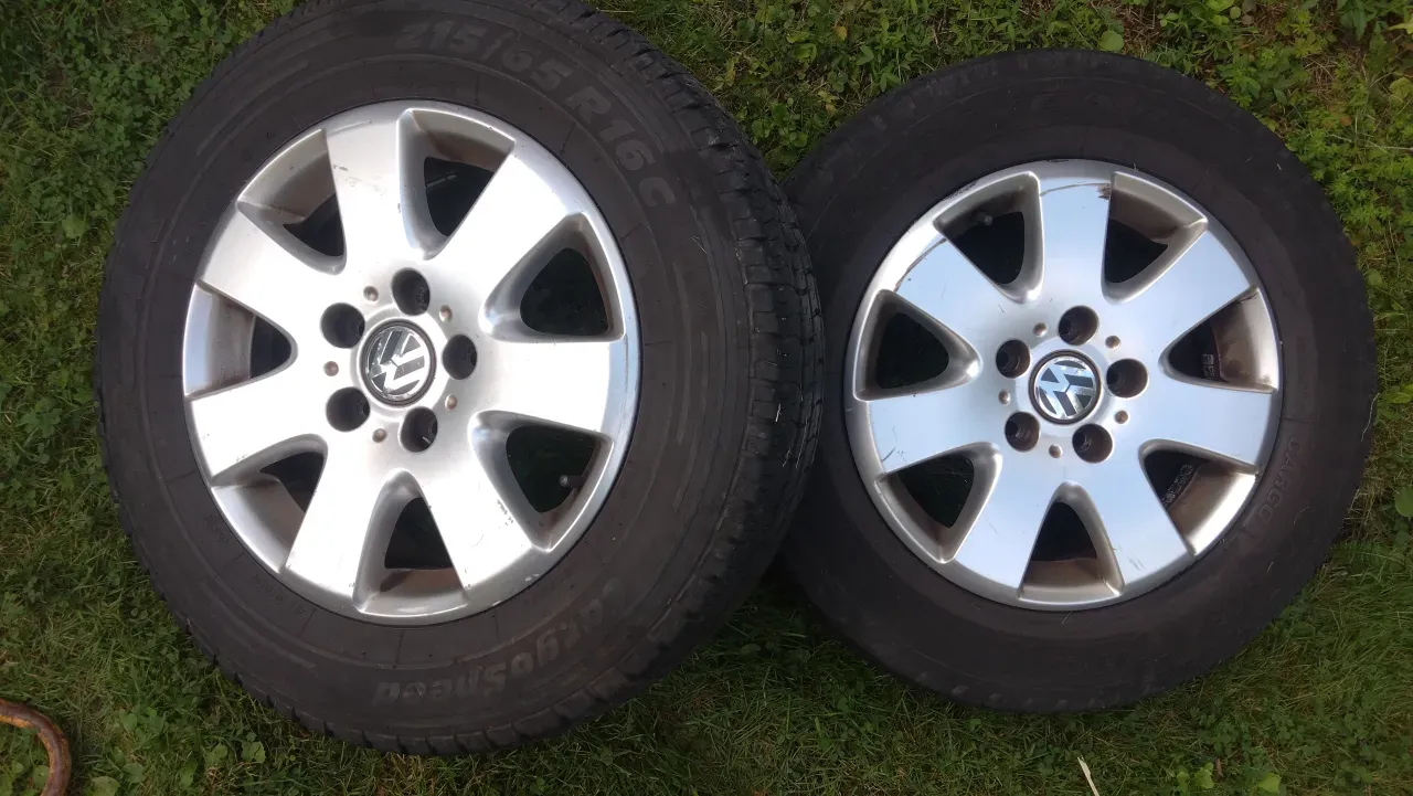 Till VW T5 Transporter/Caravelle, original aluminiumfälgar med sommardäck varav 1 st bra mönster, resten sämre. Repor finns. Hämtas i Vårdö.
