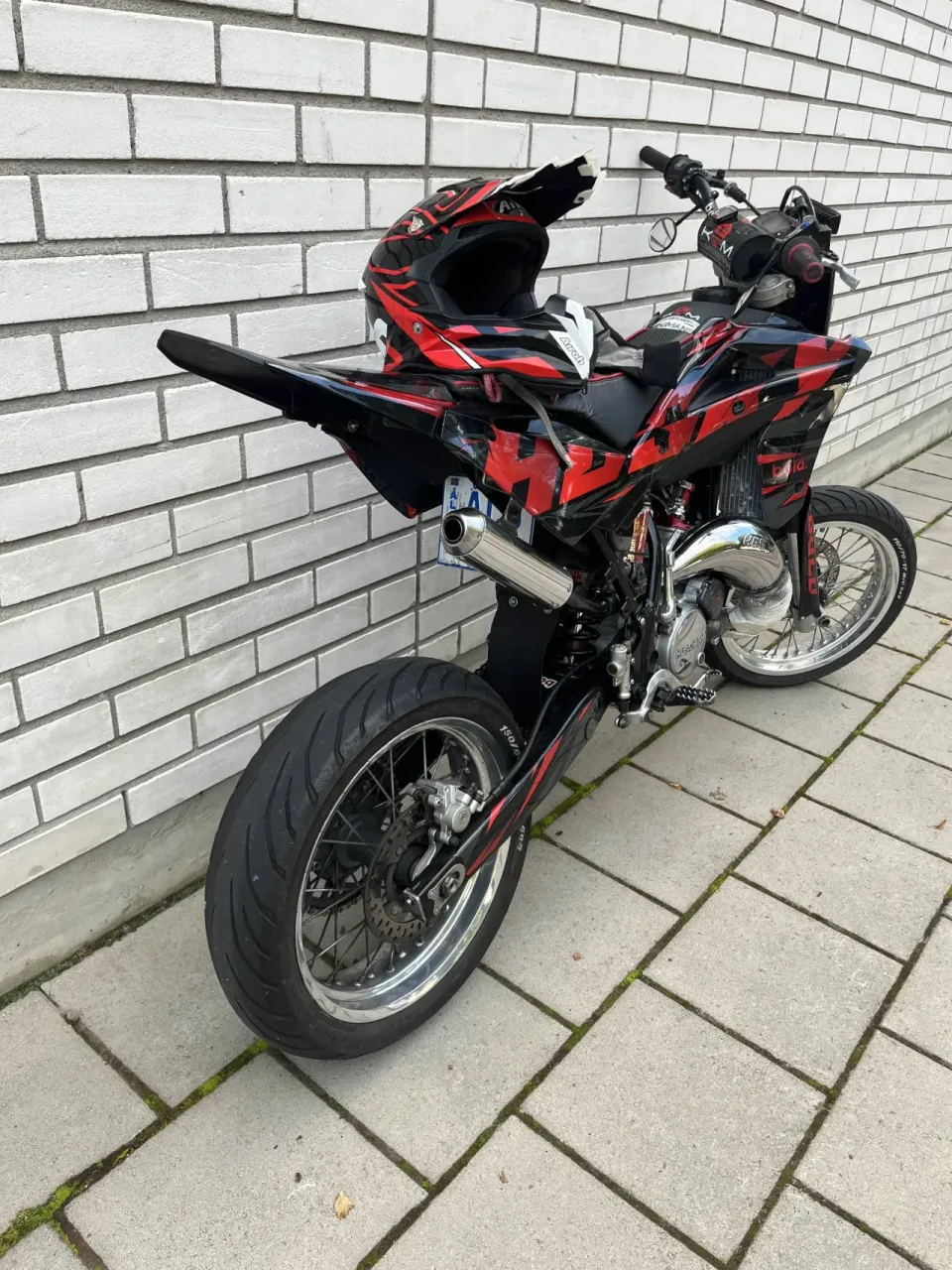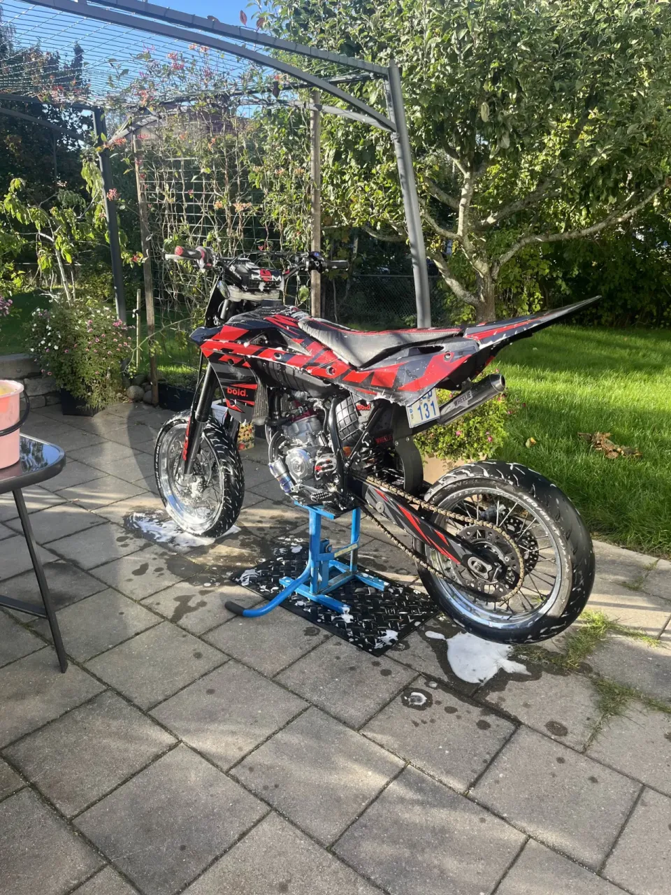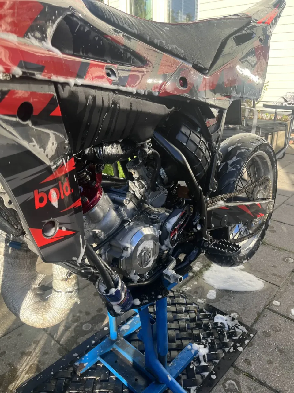 Rent estetiskt så är det ett semi custom dekalkit från BOLD, KRM sadelöverdrag, barpad, styre och grepp.