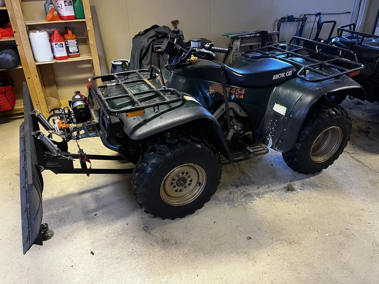 Arctic Cat Bearcat 454 från 90-talet. Går och funkar, dock lite dåligt på tomgång så en service skulle inte skada. Slitage finns givetvis. 2800 euro med snöblad, 2500 euro utan.