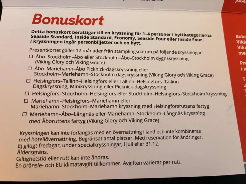 Presentkort på kryssning inkl. hytt för 1-4 personer på Viking Line. Gäller på ett flertal rutter (se bild). Stämplat 10.11.2025 och giltigt 12 månader framåt. Finns i Mariehamn.