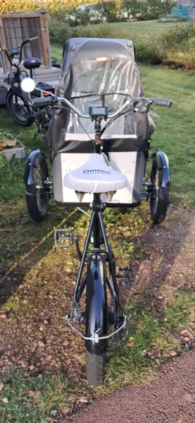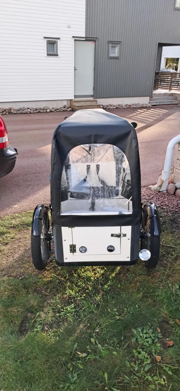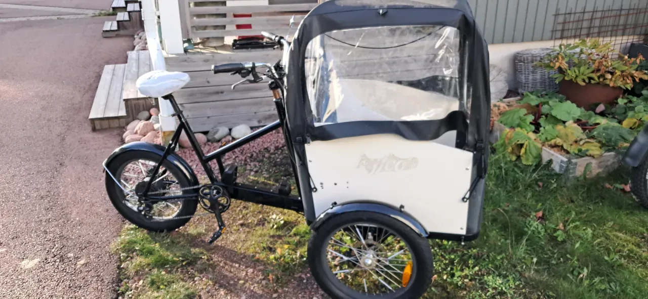 Lyfco lådcykel med el assistans. Stått ute så har lite rost och men fungerar bra ändå. Batteriet ger ca 40-50km räckvidd beroende på förhållande samt lastvikt. 8 växlar. Dubbla hydrauliska bromsar fram samt 1 vajebroms bak. Avtagbart tak för lådan. Sittbänk som även fungerar som förvaringsbox. Bälte för barn som sitter i lådan.