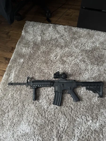 Eldriven, full auto eller semi auto eftermonterat sikte eftermonterat hand grip. Skottmedföljer Mycket bra skick inte mycket använd