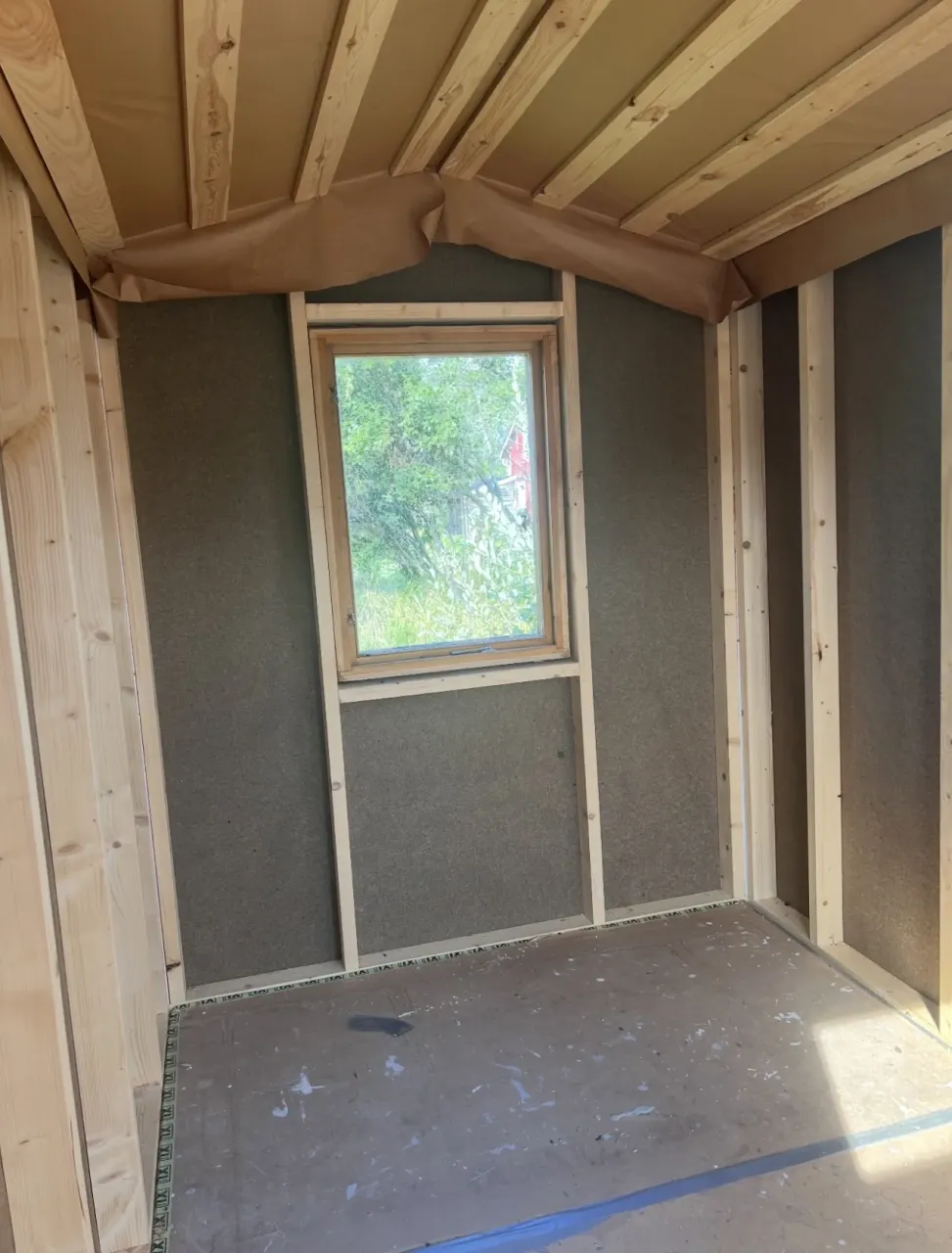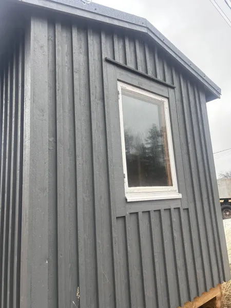 Stabil konstruktion med modern utsida, isolerade väggar och fint ljusinsläpp från fönster. Invändigt är den förberedd så du kan färdigställa efter egen smak.