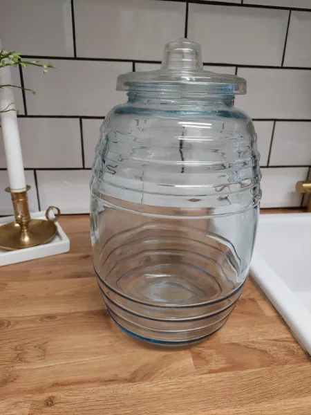 Fint skick glasburk 30cm hög lite ljusblå ton även kallad "honungsburk" med lock