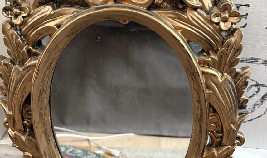 Spegel med dekorativ guldfärgad ram i plast. Höjd 36 cm, bredd 27 cm.