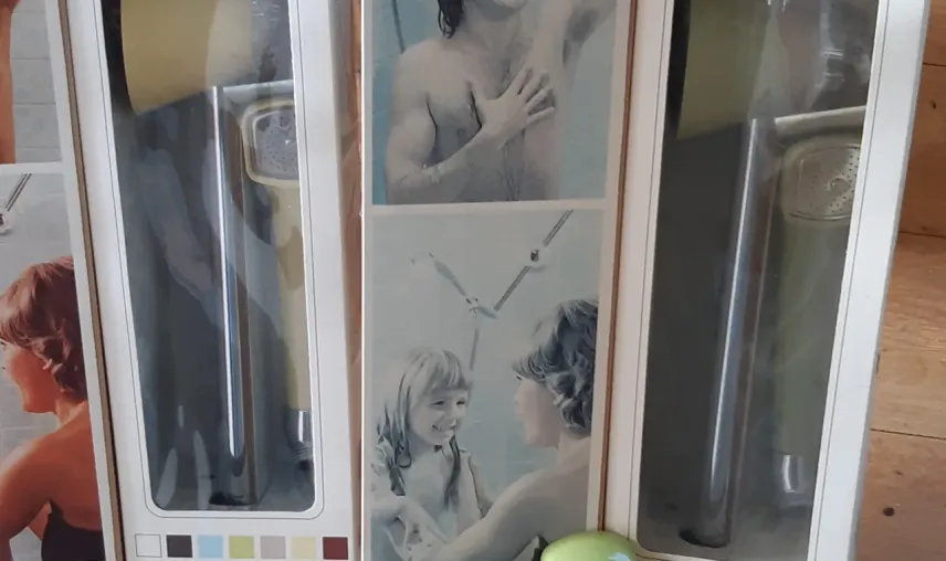 Duschmunstycken (handdusch) med fäste i originalförpackning, troligen från 60-talet. Finns en blå, två gula och en ljusgrön. 5 euro/förpackning. Finns i Saltvik.