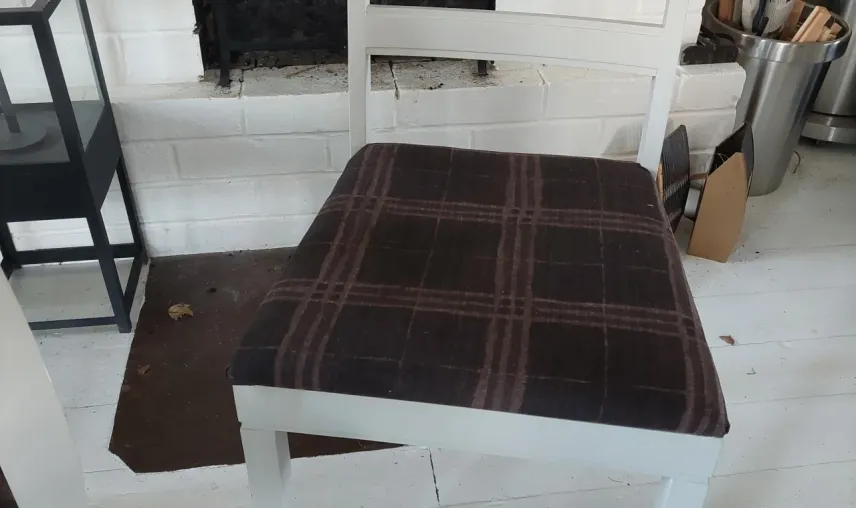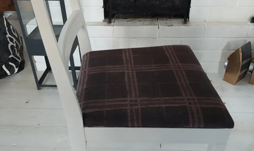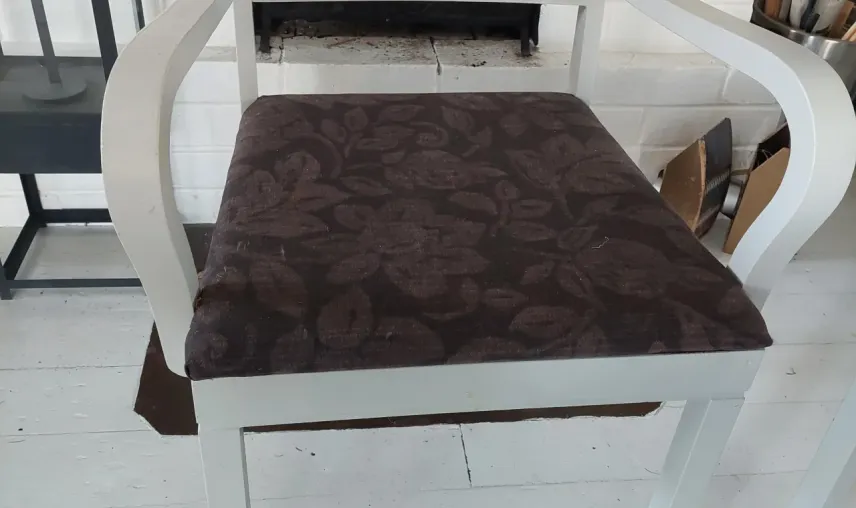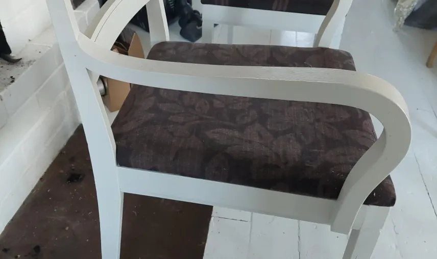 Stolarna är målade i ljusgrått och är klädda i brunt snyggt tyg som lätt kan bytas om man vill.