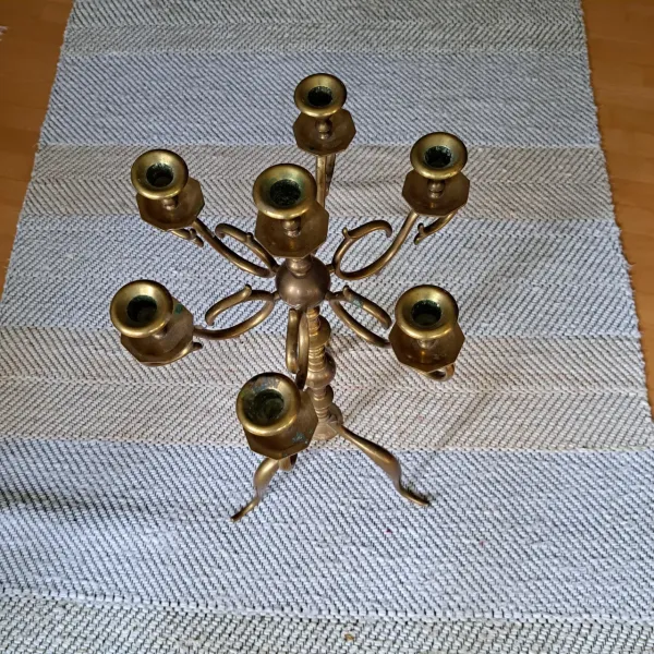 Sjuarmad, golvstående kandelaber i mässing.