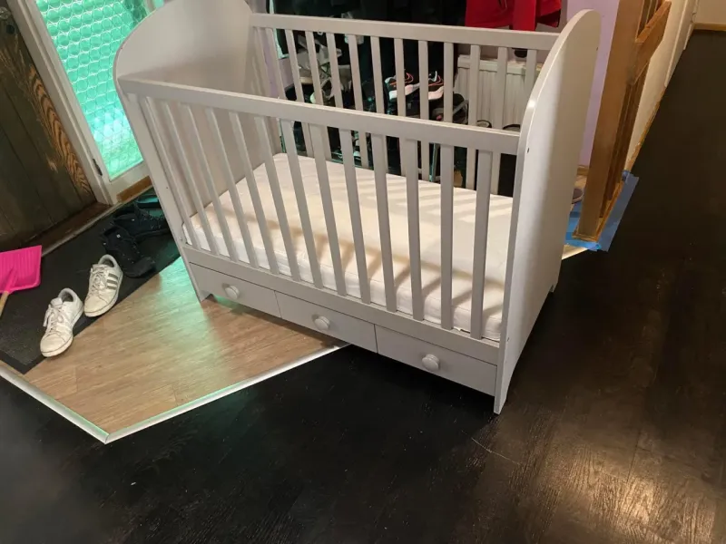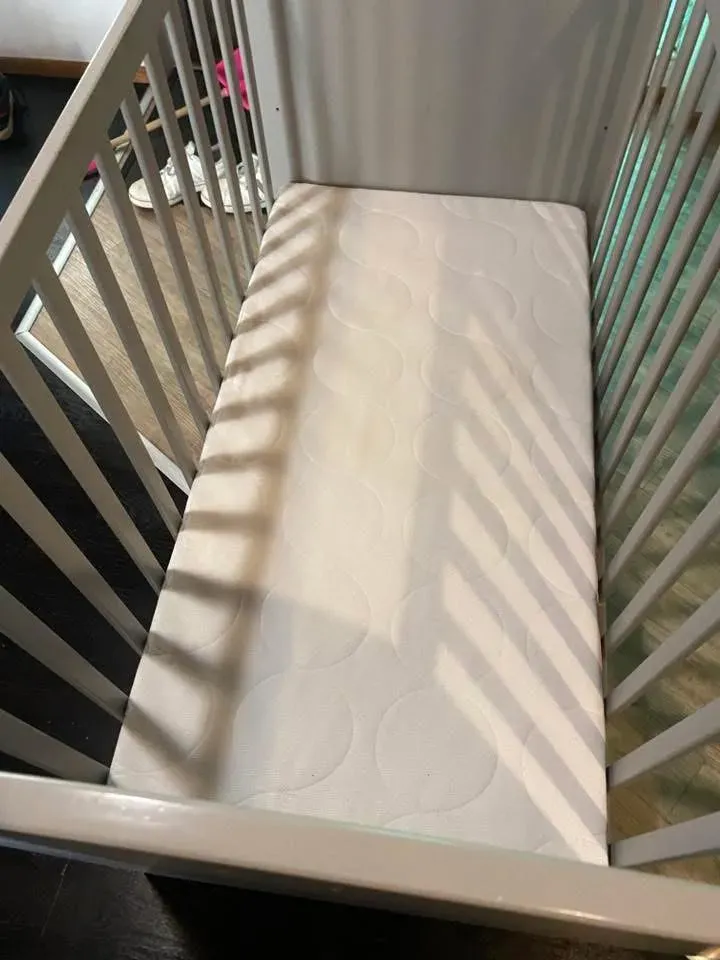 Grå splälsäng med förvaring. Maddras i bra skick.