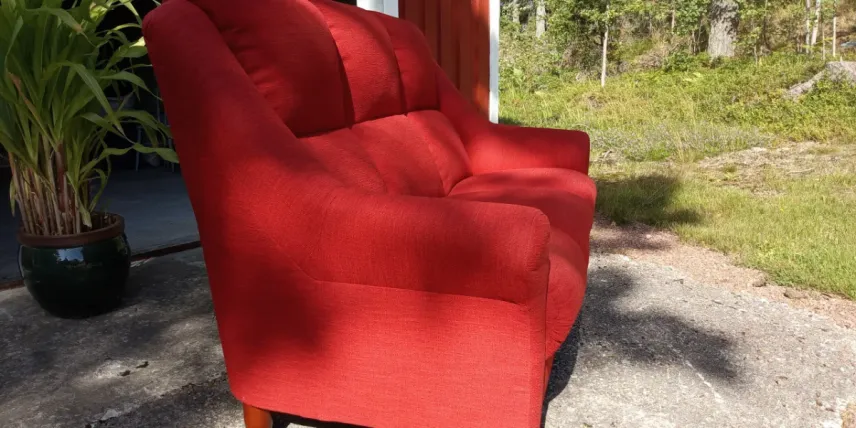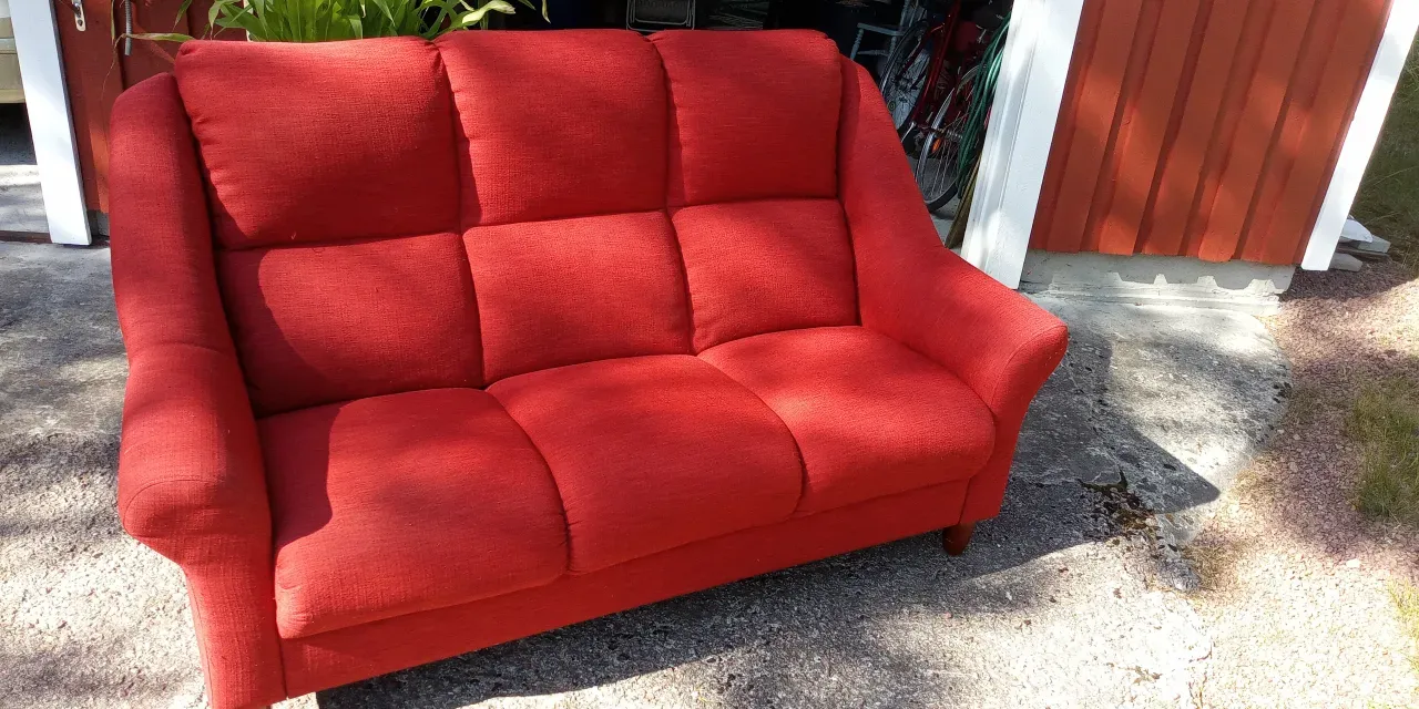 3 personers röd tygsoffa. Ngt högre sitthöjd. Lite använd och gott skick.