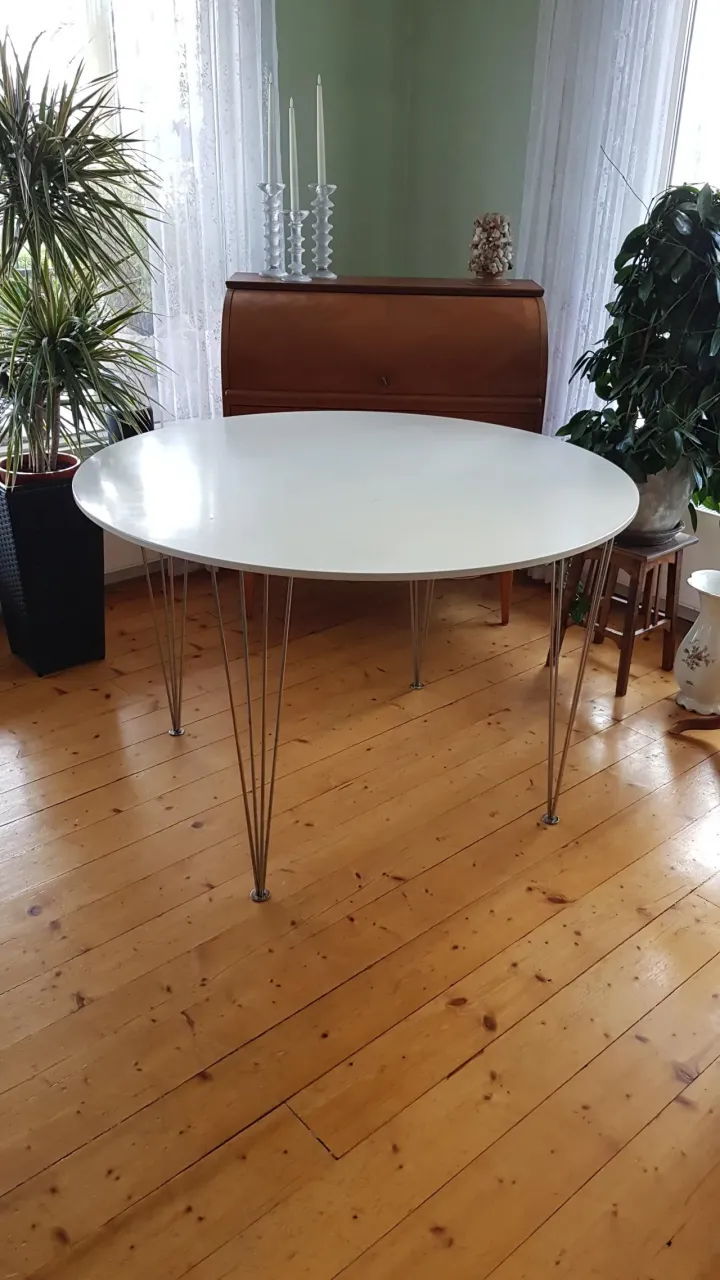 Runt bord av modellen Plain från Mio. 110cm, vitmålad med spännben i kromad metall. Finns i Mariehamn