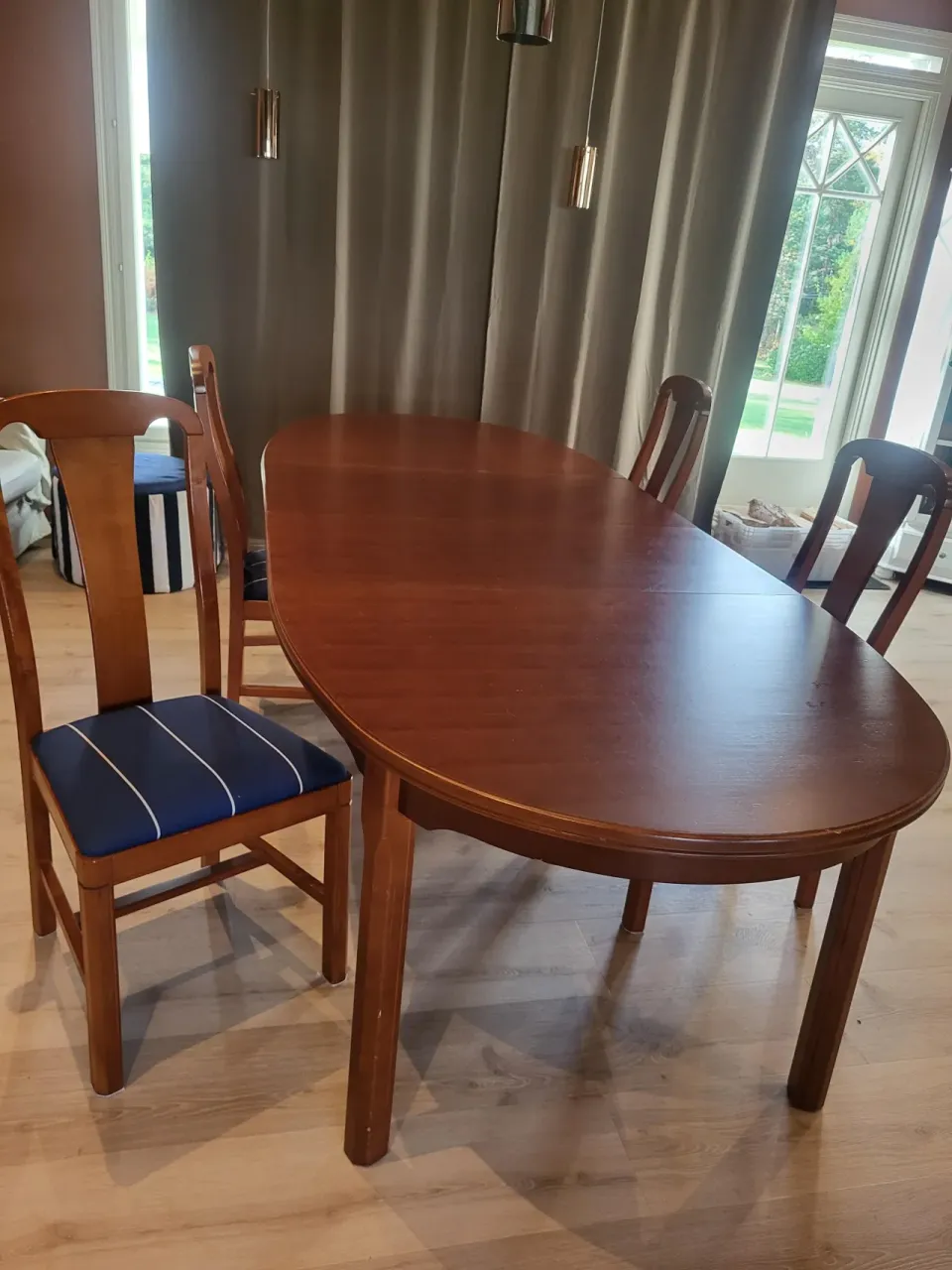 Stadigt bord i massivt körsbär inkl 4 tillhörande stolar, omklädningsbara. 105 cm × 165, 215 eller 265 cm. 2 iläggsskivor medföljer så antingen väldigt långt bord eller mindre storlek. Tillverkat i Finland. Fint skick!