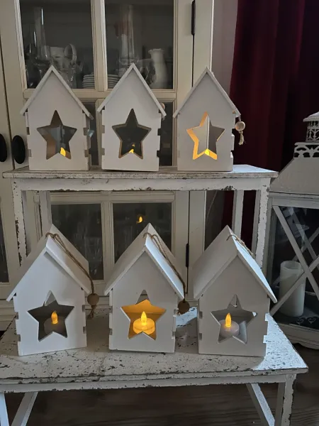 6 stycken vita lyktor, med batteri kan behöva bytas i några då de lyser svagare.kan hängas i snöret.