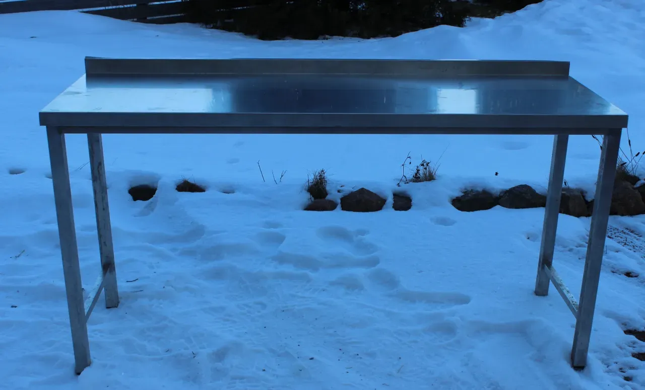 Beg. rostfri arbetsbänk.. Mått: 170 x 63 x 84 cm. Finns i Saltvik.