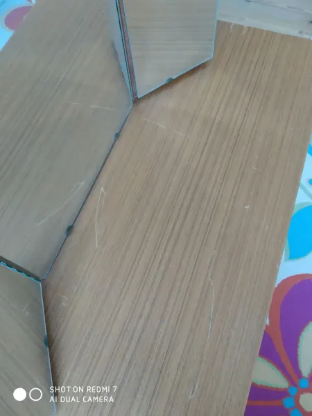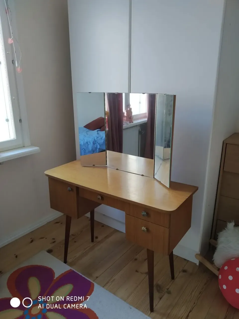 Sminkbord i äldre stil. Finns lite repor på ytan och viss spår av användning men annars i fint skick. 93 cm bred, 69 cm hög, 35,5 cm djup.