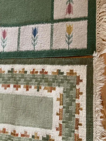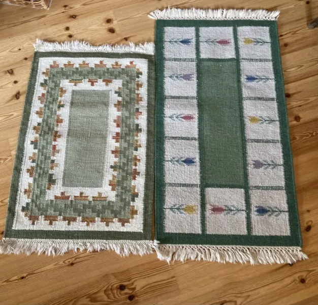 2 mindre röllakan mattor 1 st 123x64,5 cm o 1 st 98x62,5 cm i grönt mönster hela o rena köp 2 för 40e el 1 25e