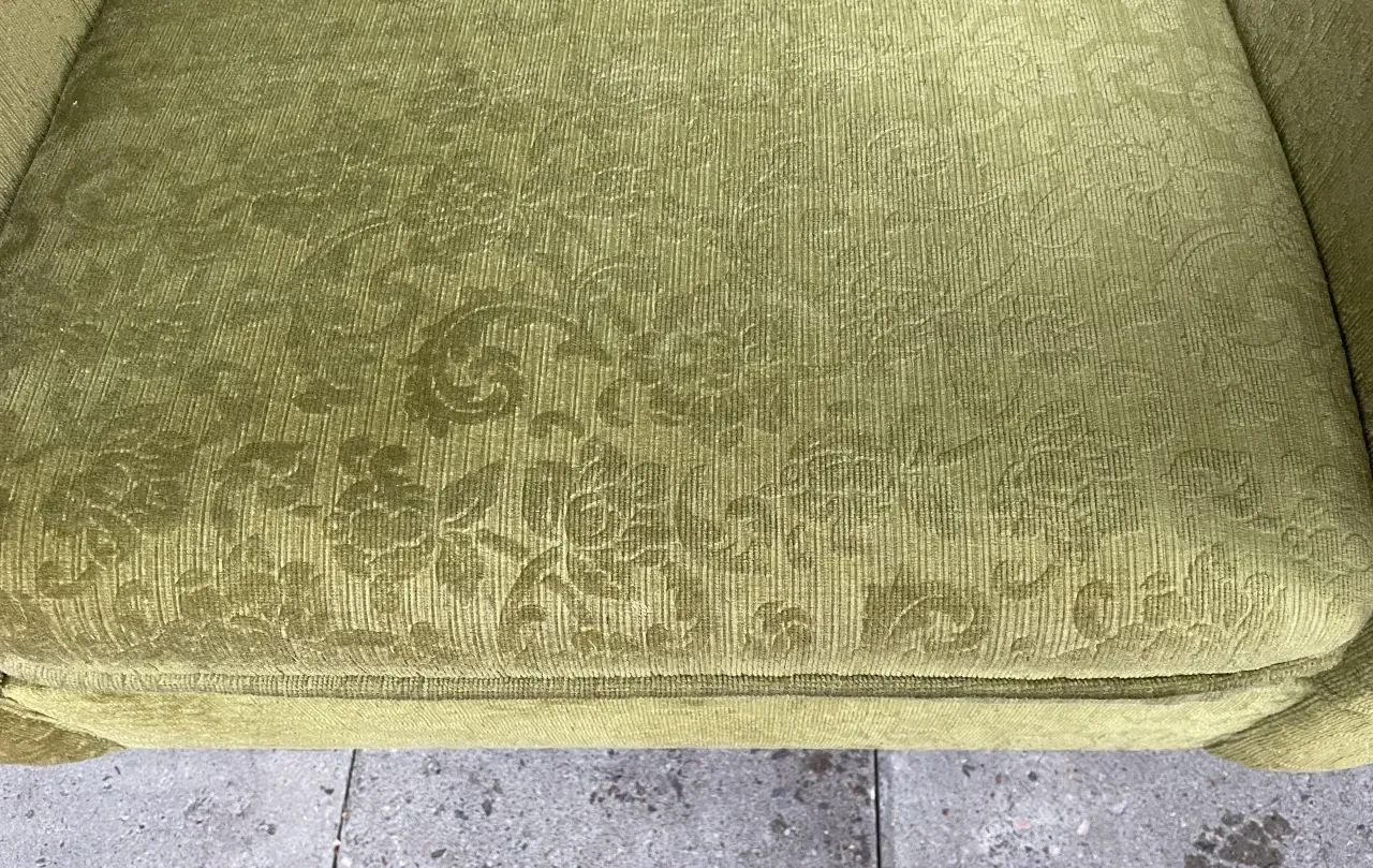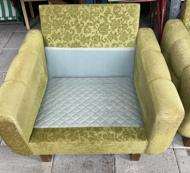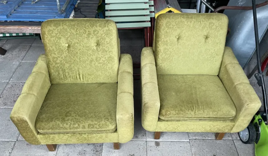 2 st retro fina fåtöljer i ljusgrönt stadigt vackert sammets liknande tyg ifint orginalskick ca 87 h, 75,5 b o 67 cm djup köp 2 för 60e el 1 st 40e transport finns