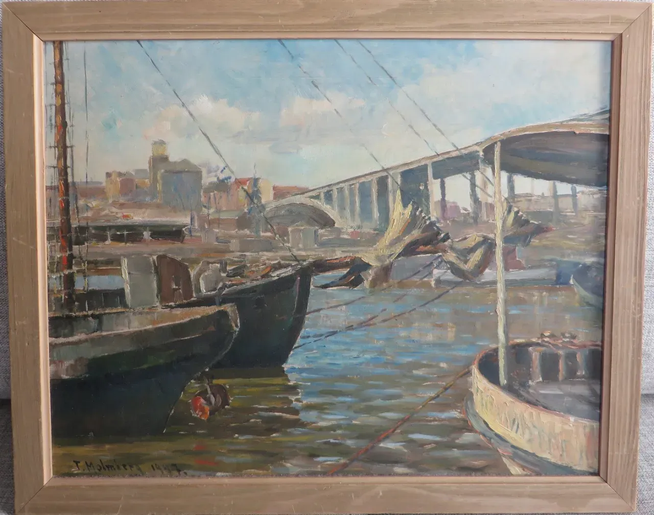 Oljemålning på pannå av Thure Malmberg 1947. Motiv Liljeholmsbron i Stockholm med skutor i förgrunden. Mått (motiv) 46 x 36 cm.