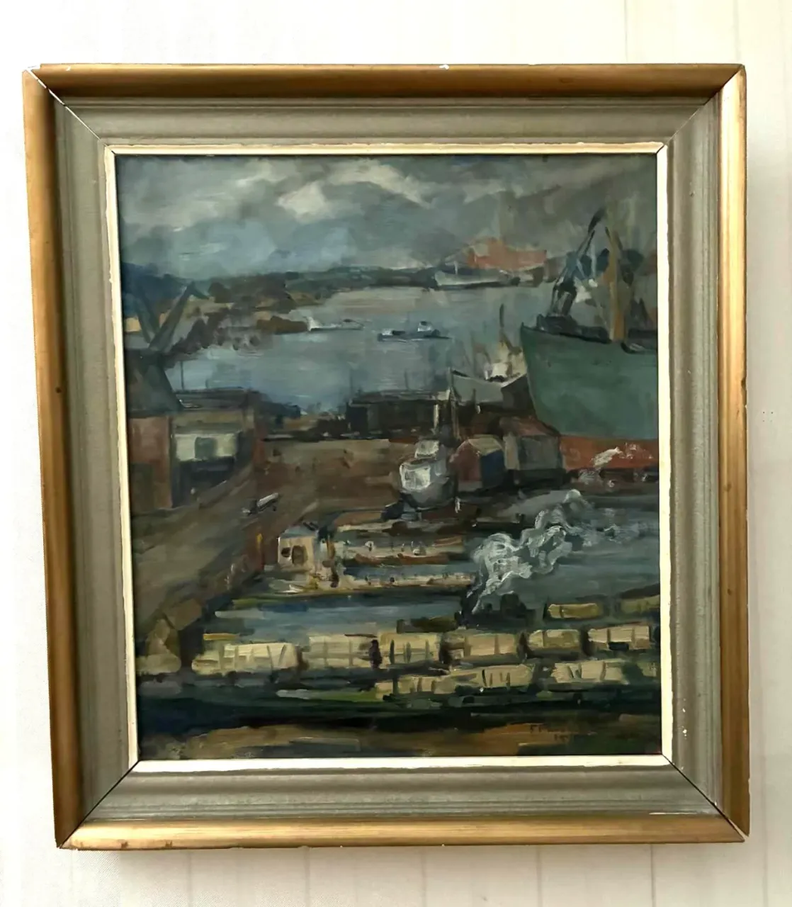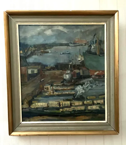 Olja på duk, okänd hamn, signerad, 60 x 65 cm. Mycket fint skick. Finns i Mariehamn.