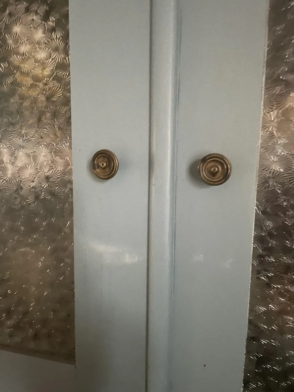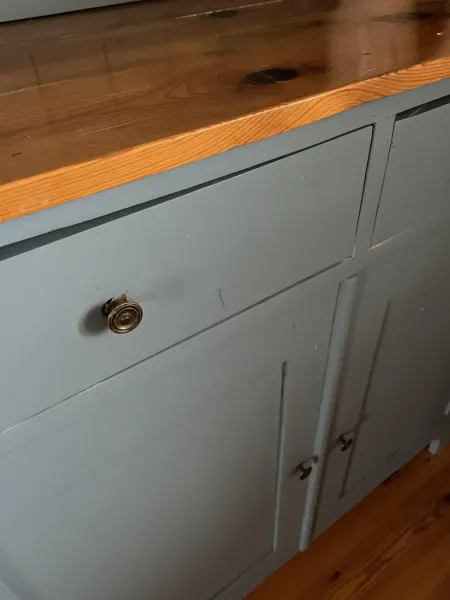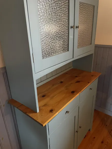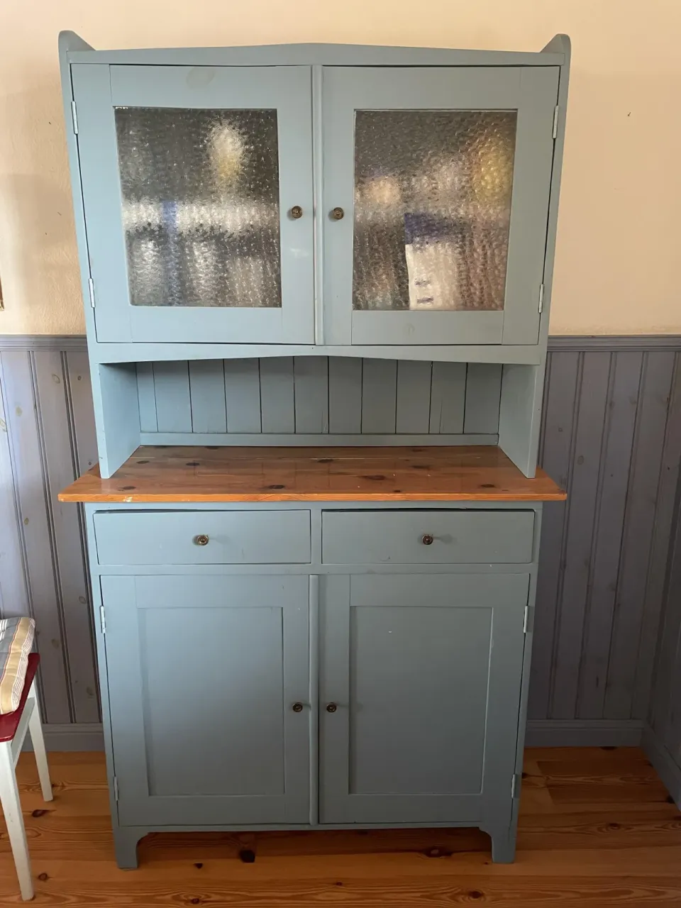 Fint gamnalt typ köks- skänk/skåp ink överskåp med vackra glasdörrar, allt i bra skick (även i skåpet) ,målat i gammeldags blå färg hyllan omålad 1,86 h o 1,06 L,42 cm d är lite mer blå i verkligheten än bild