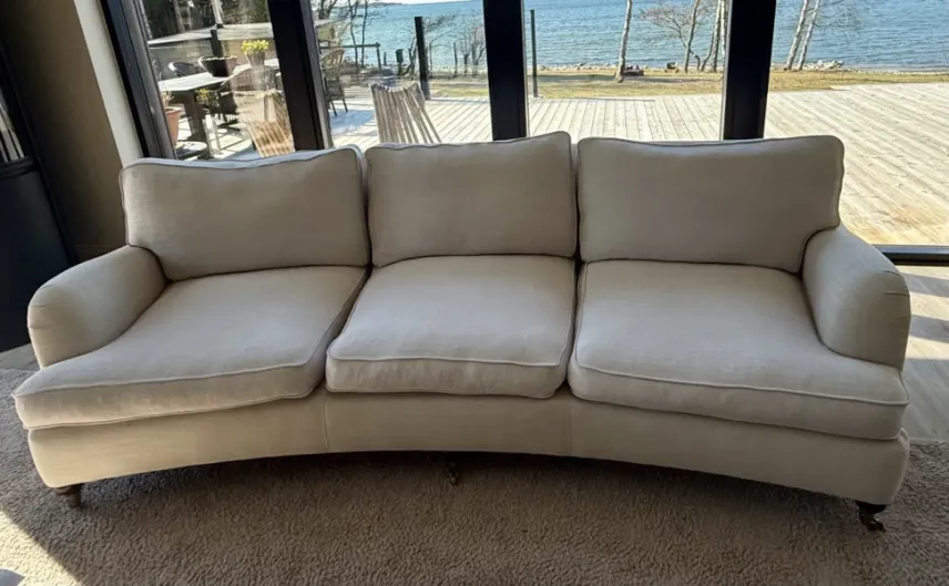 Stilren svängd Howard-soffa i 3,5-sits med hög komfort. Kuddarna har dunfyllning och avtagbara överdrag.