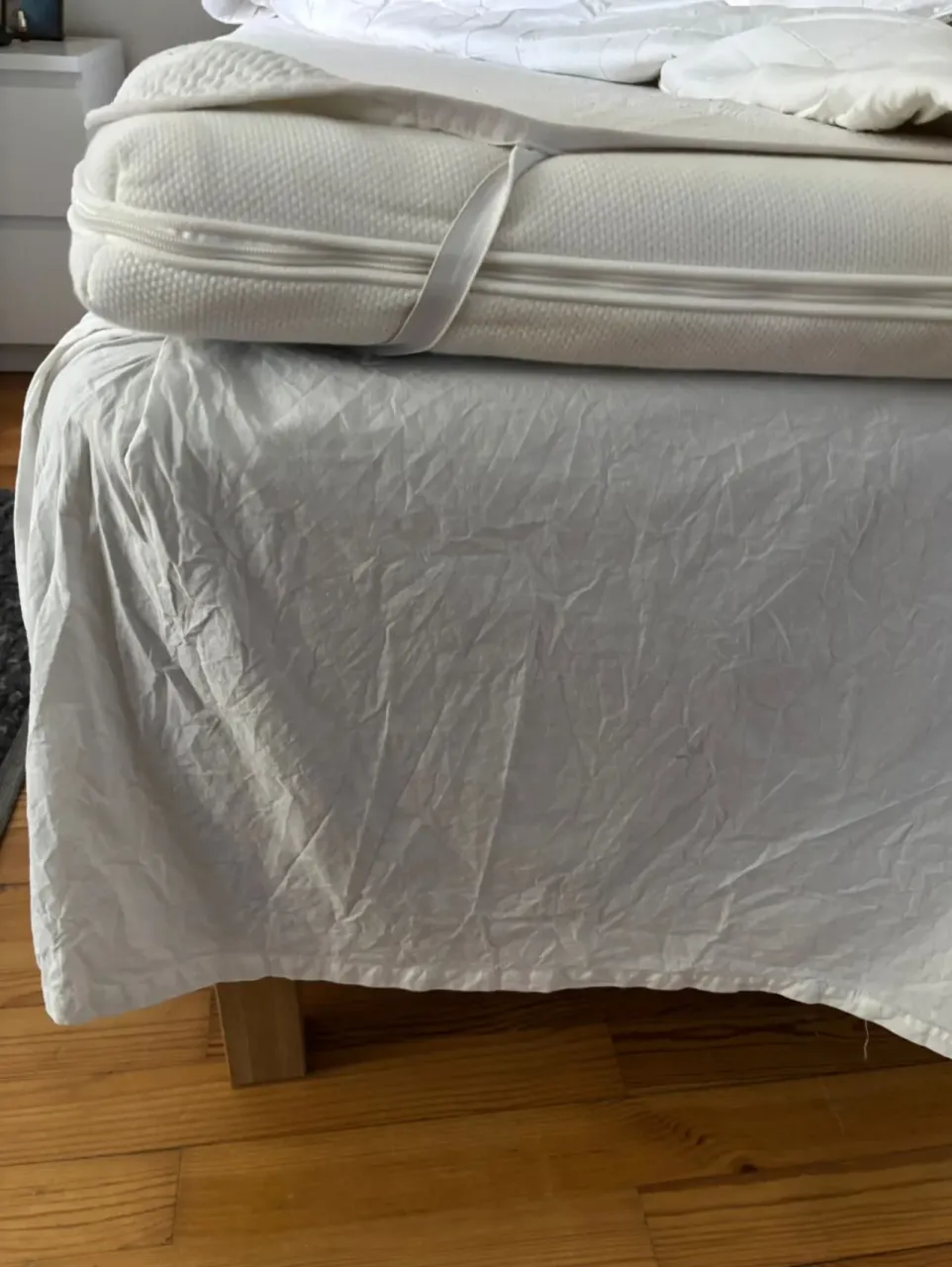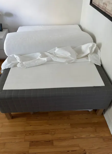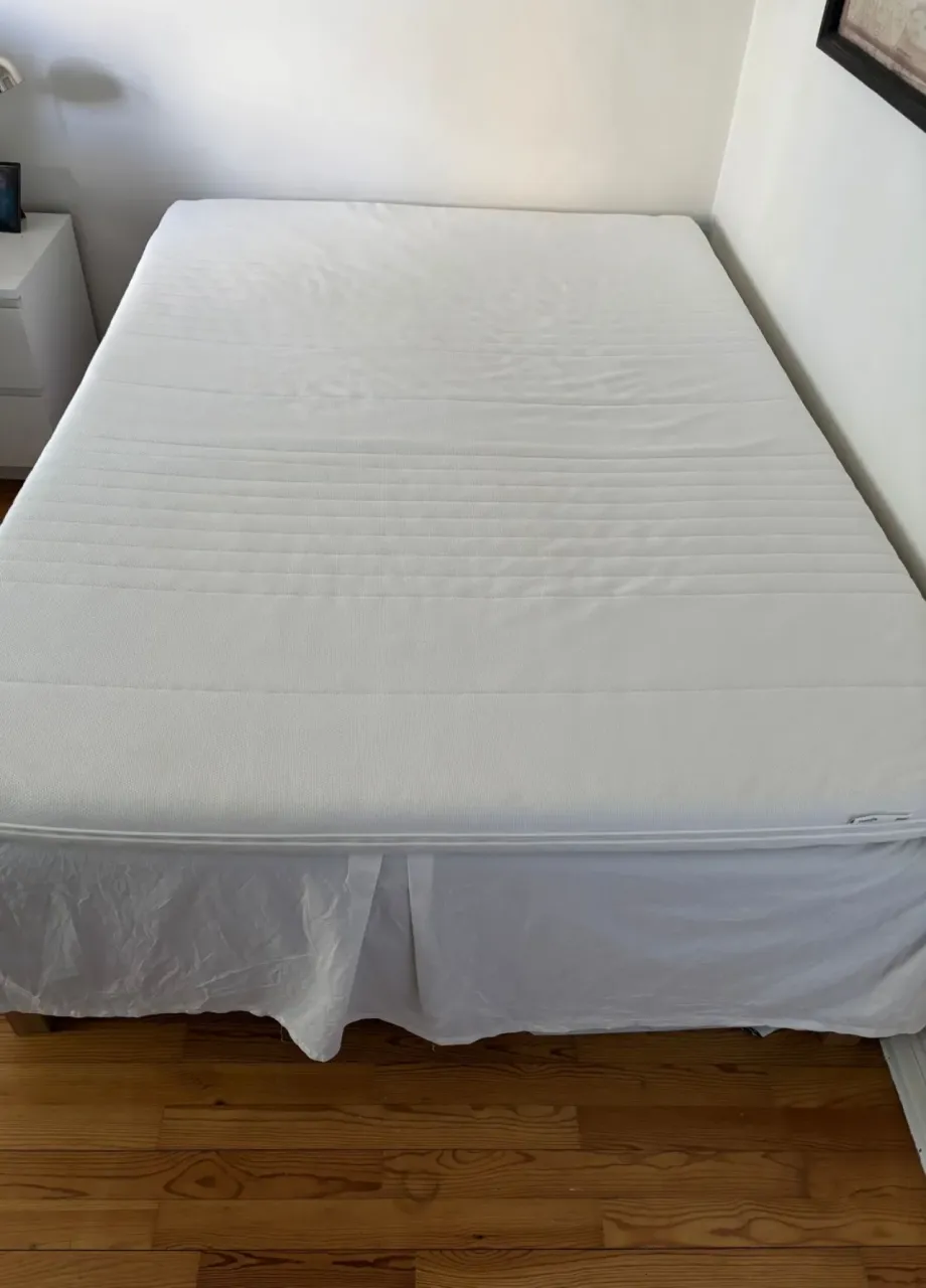 Medium/fast. Fint skick - Alltid använt med madrasskydd / madrassöverdrag. Bäddmadrass Ikea Tussöy, sängben i ek samt sängkappa, nattusbord ingå. Djur- och rökfritt hem. Nypris över 6000 sek trsnsp finns