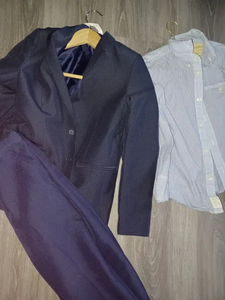 Mörkblå kostym, komplett med skjorta om man vill ha medföljer. Strl.140. Använts 1 gång.